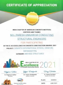 • Appreciation for Participating in the IC-ACI Excellence in Concrete Construction Awards-2021, Project-Samarth International School, Virar (W) in Category – Mid Rise Structures.